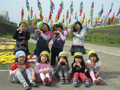 大正川の河川敷で行われたチューリップアートを見学しました。大空いっぱいにたくさんのこいのぼりがおよいでいて、子どもたちは大喜びでした。