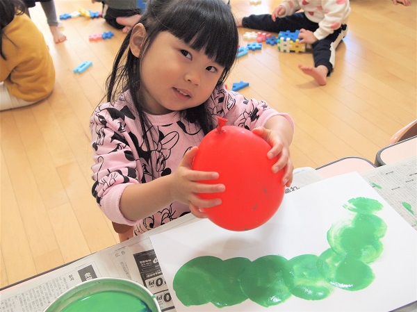 絵画制作では風船を使ってはらぺこあおむしの絵を描きました。