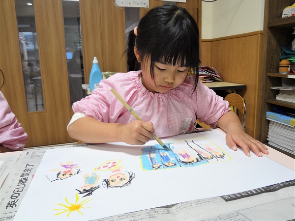 絵画制作では、ペンで描いたあと、絵の具で色を塗りました。年長児らしい細かく描きこまれた作品になっています!!