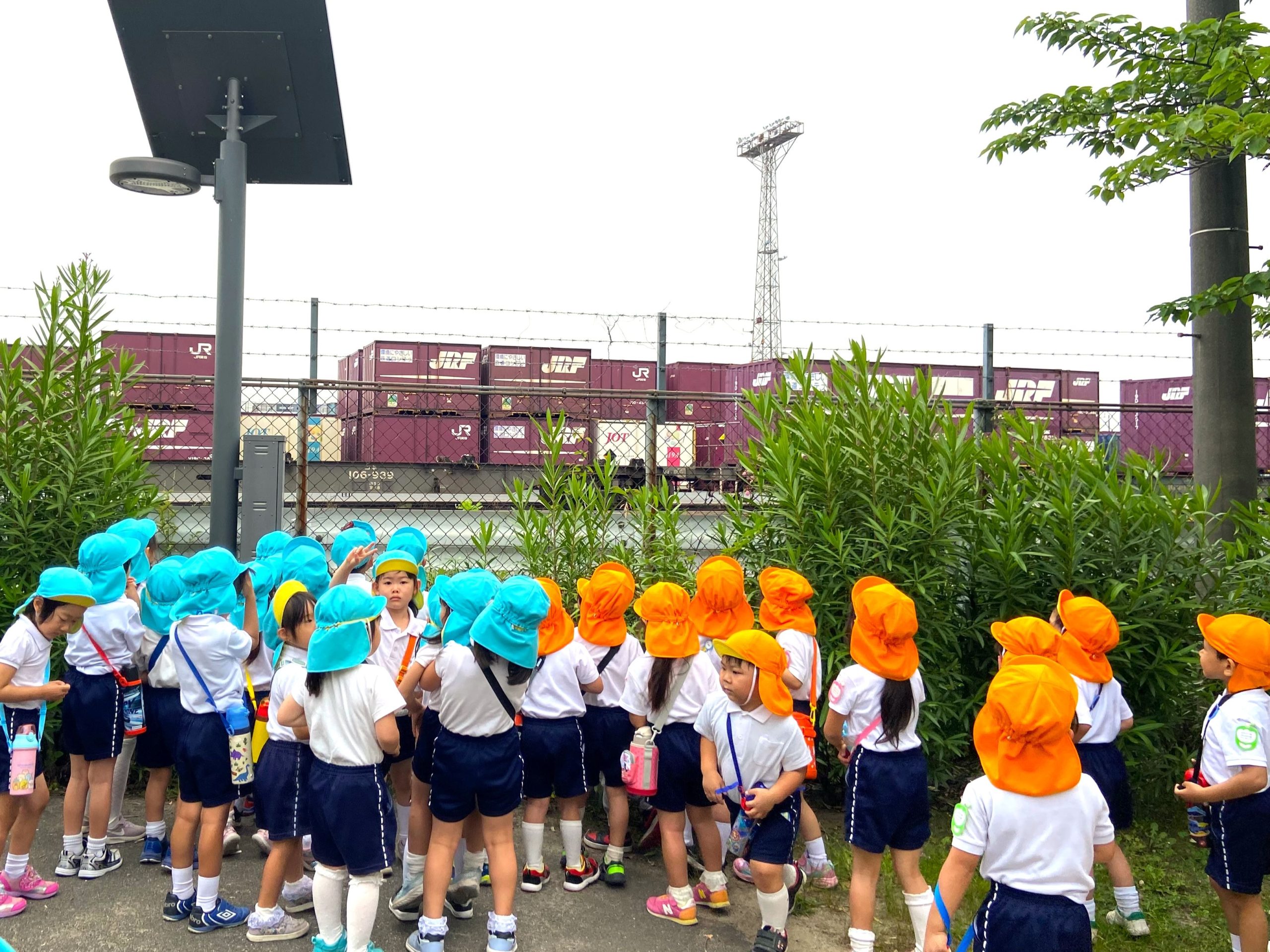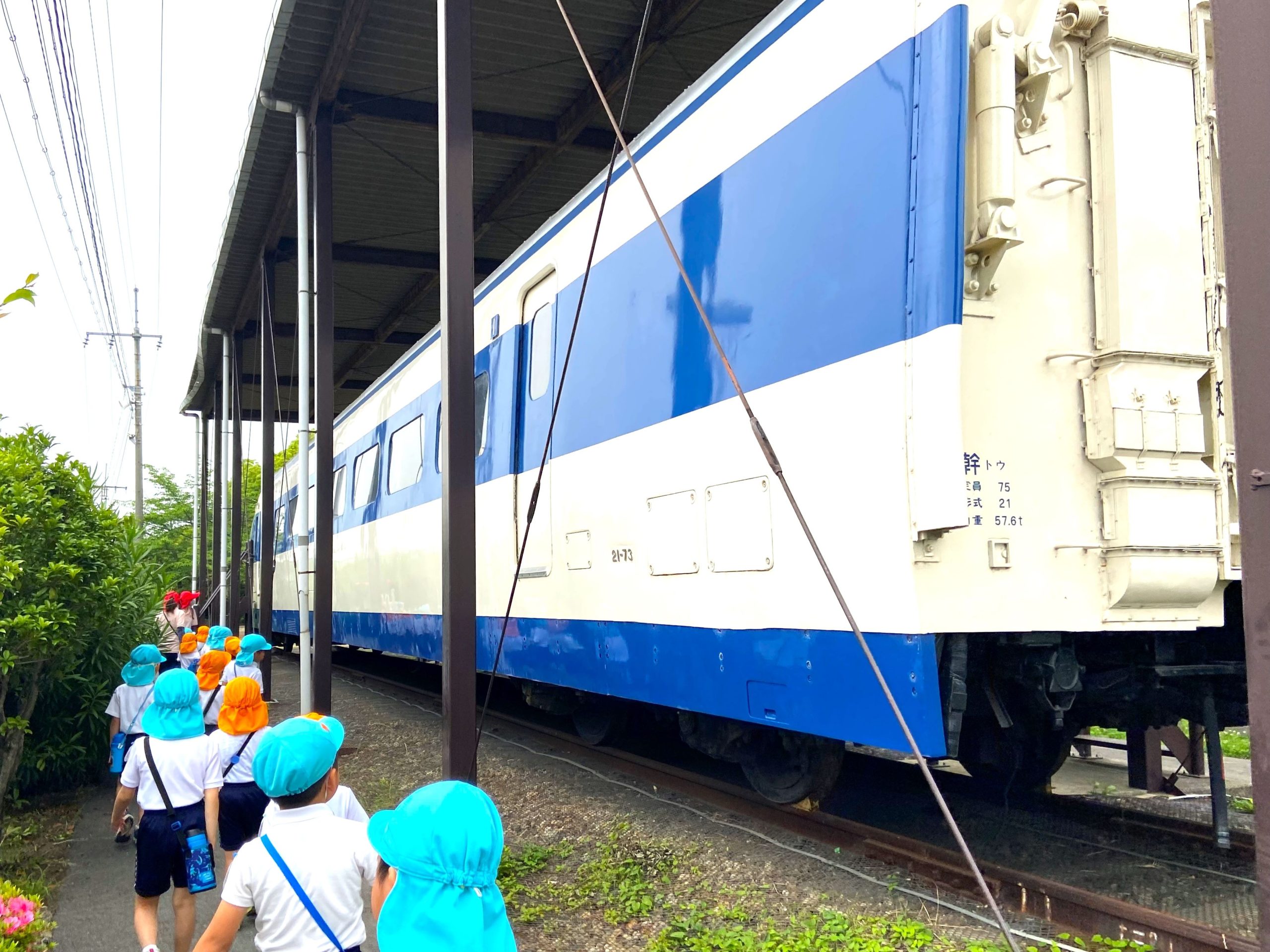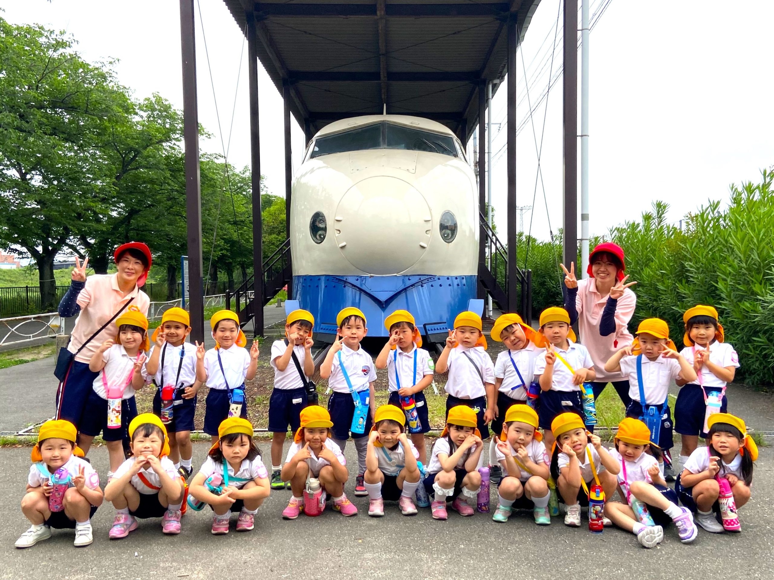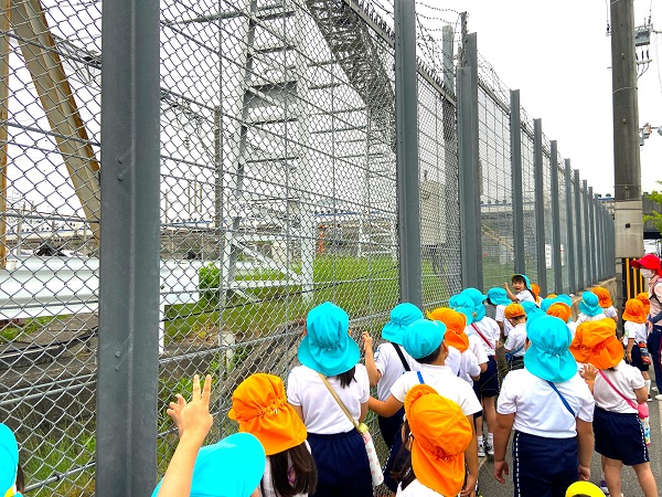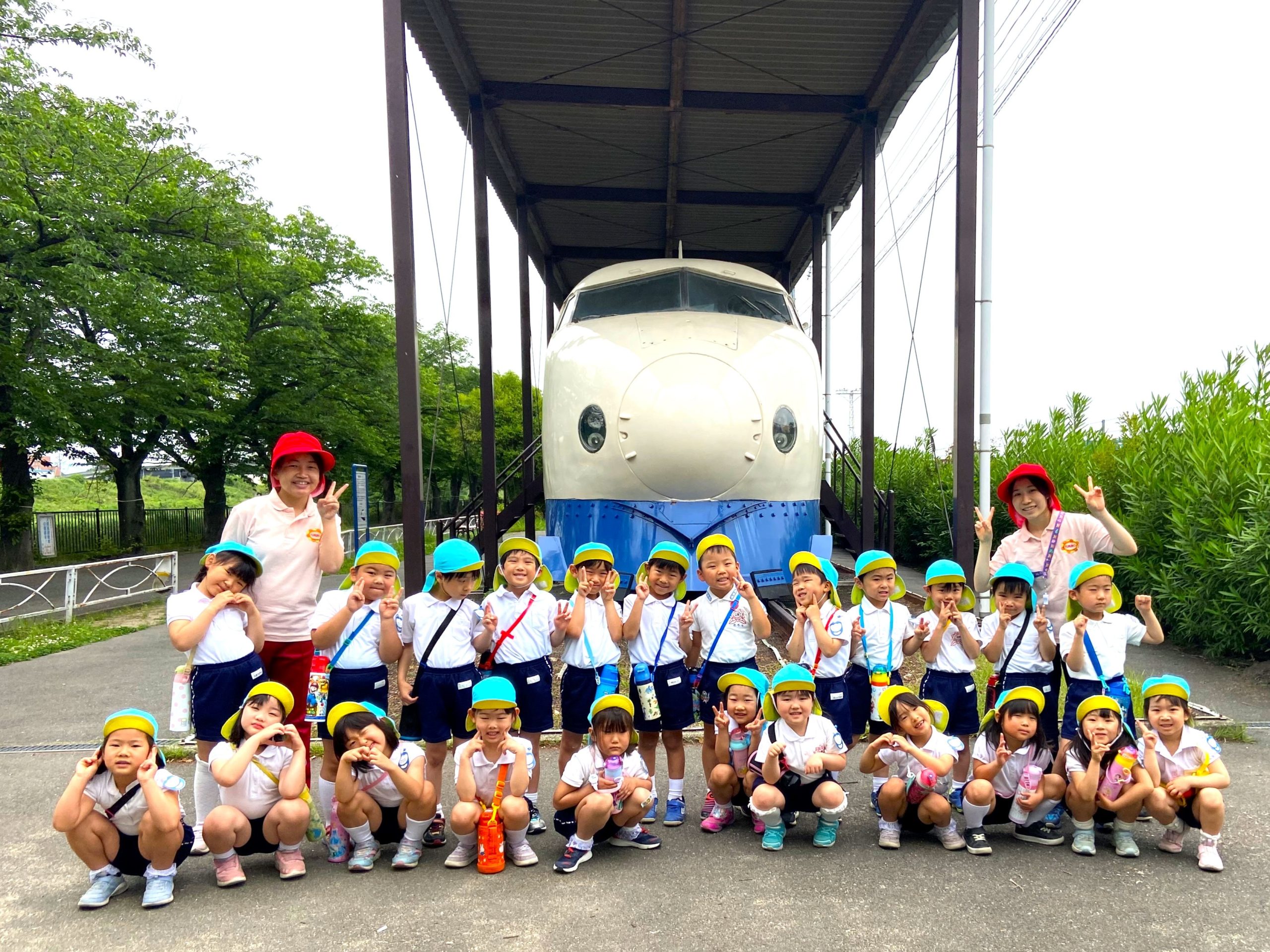 遠足「新幹線公園」 5月20日(金)4歳児クマ組・5歳児キリン組で、新幹線公園に遠足に行き、新幹線と機関車を間近で見学しました。 クマキリン 隣のコンテナを積み込むフォークリフトも興味津々で見ていましたよ! 最後に新幹線の鳥飼基地に並ぶ新幹線や基地に入ってくる新幹線も見ることができました♪