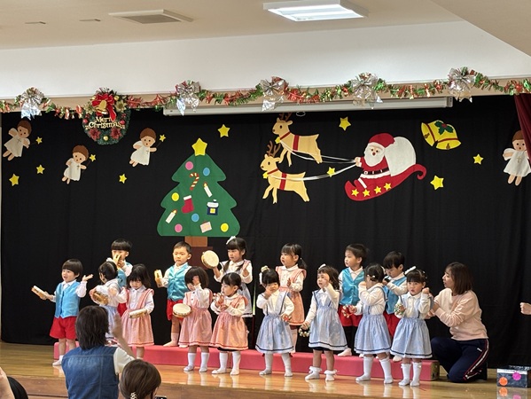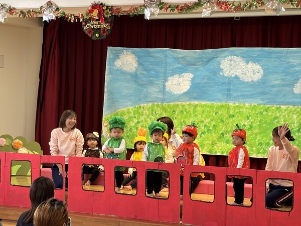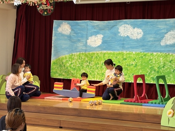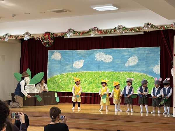 舞台に立つだけでも緊張する中、みんなで頑張って練習した劇遊び「おおきなかぶ」や楽器遊び「ミッキーマウスマーチ」を一生懸命披露してくれました。